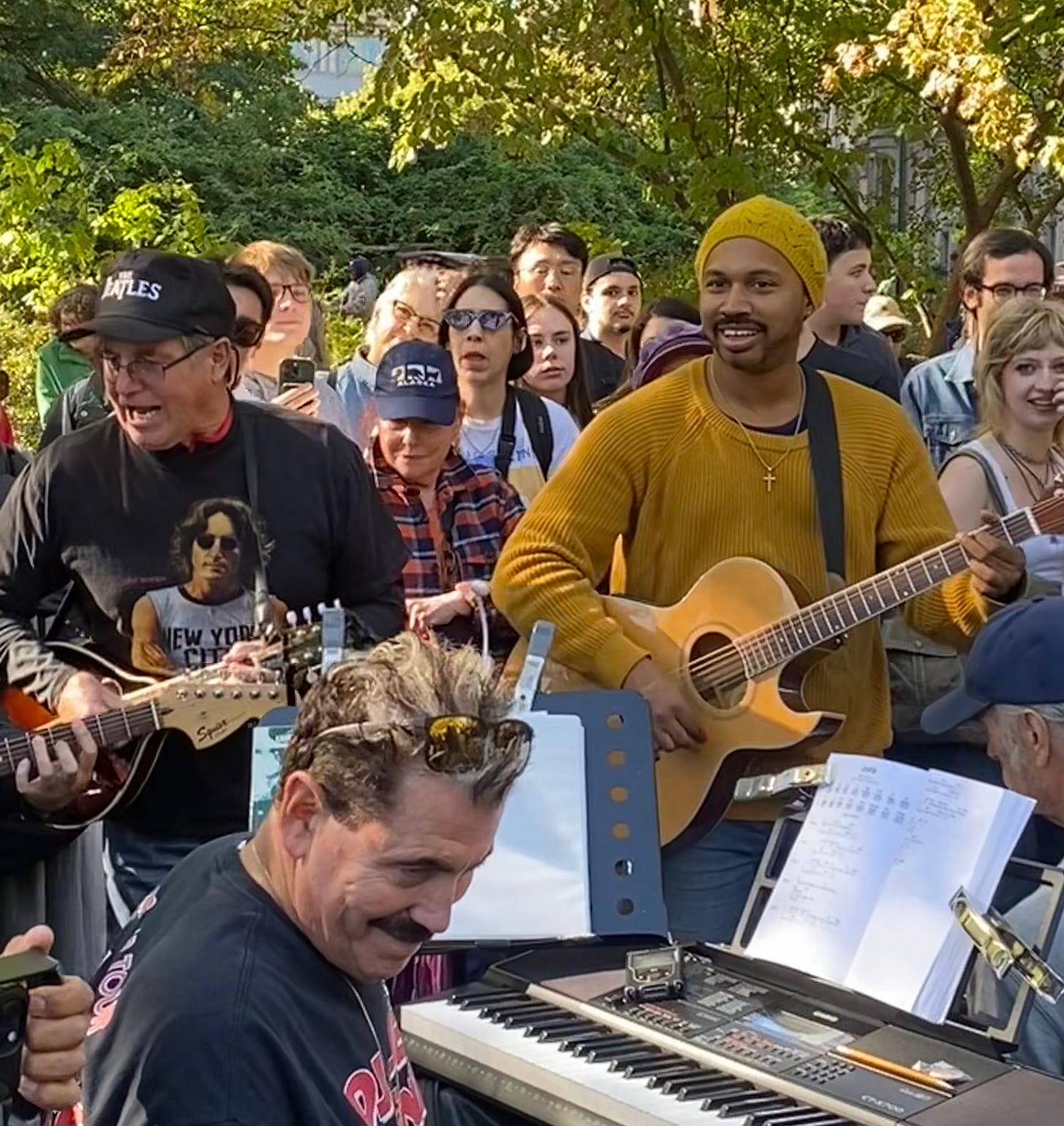 Today there was a gathering of every kind of person to celebrate how lucky we were to have John in our world, even for the brief shining time that he was given. We were a scruffy bunch surrounding a band serenading us with classics, like “All You Need Is Love”, that everyone could sing along to word for word, and lesser known, but no less brilliant, offerings like “Every Little Thing”, where most people could only join in on the chorus. There was an impromptu mosh pit, and an autistic young man who knew every note and was clearly feeling the joy. There were office workers in suits, retirees in leather jackets, mothers with babies, young punks and old drunks. It was magic.